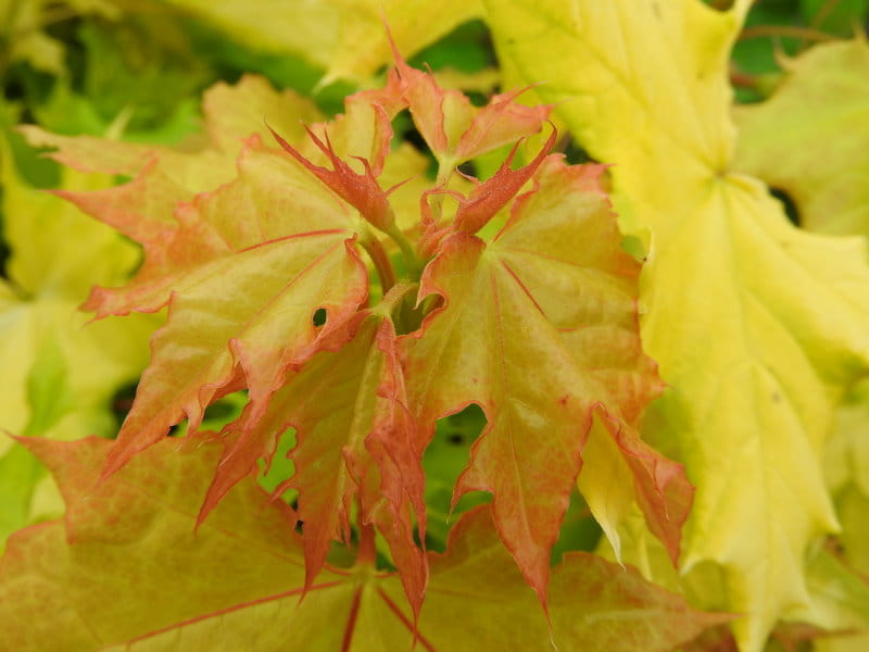 Laub und Farbwirkung des Kugel-Spitzahorns Golden Globe